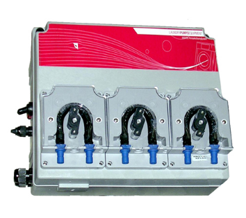 A set of peristaltic pumps with a built in flush manifold. In this way it is only necessary to fit a hose to the washer